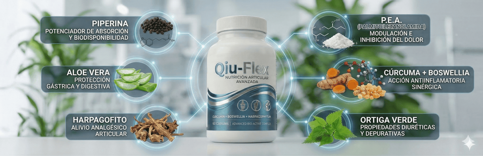 La inclusión de Piperina incrementa significativamente la biodisponibilidad de toda la fórmula, garantizando que la combinación total de activos botánicos se absorba con máxima eficacia.